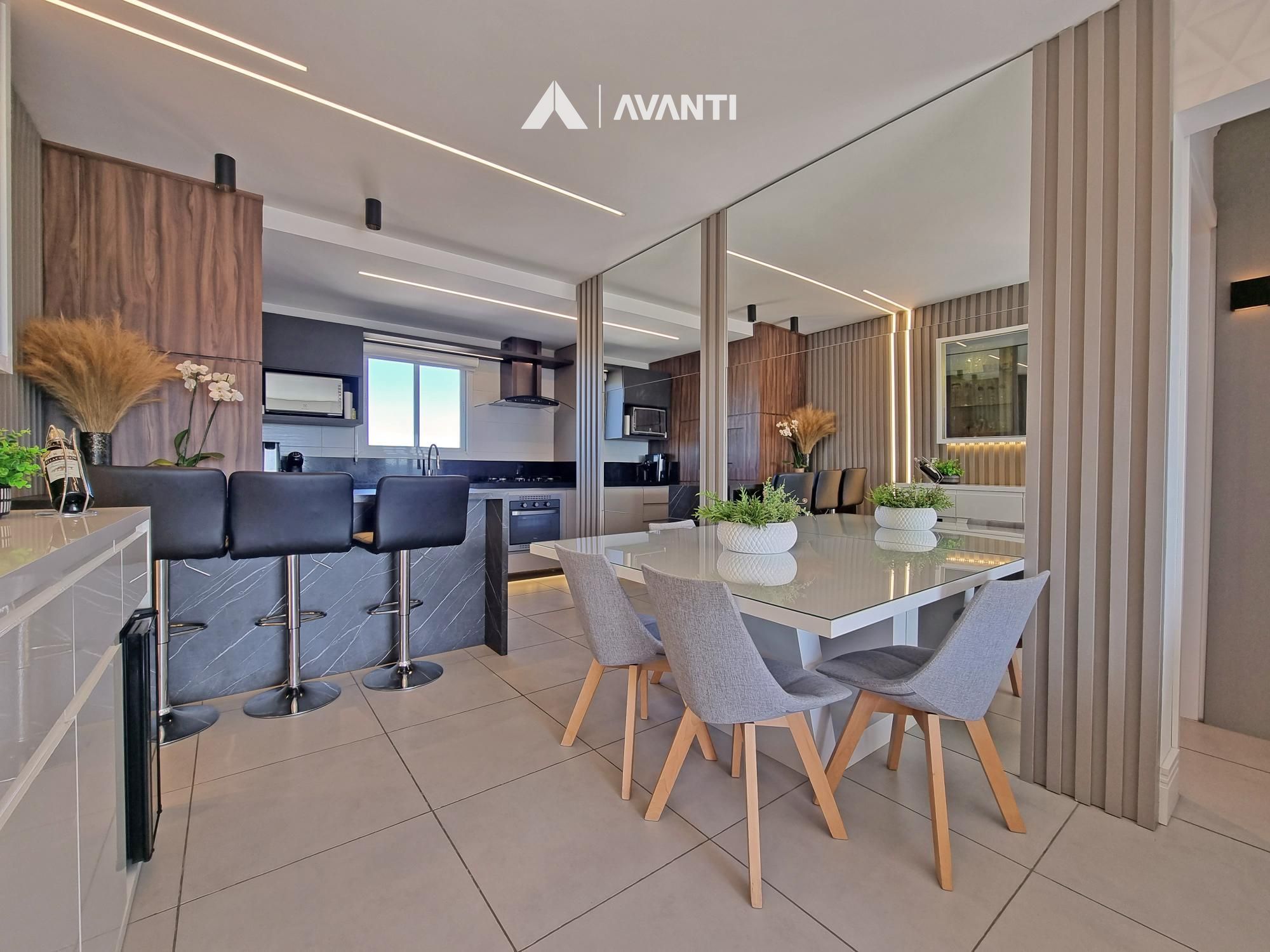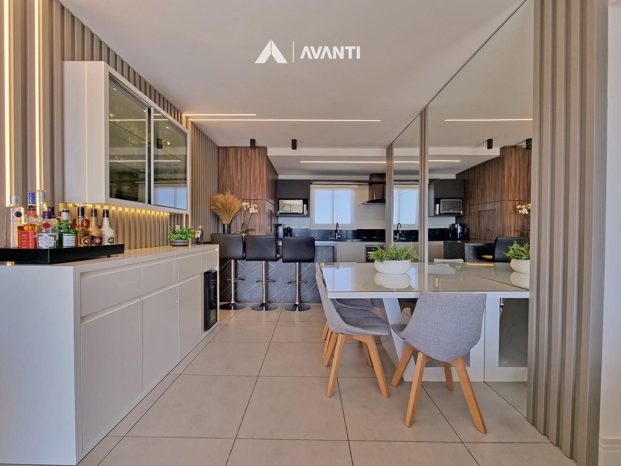 Living integrado: cozinha, estar, sacada, banheiro social, churrasqueira, vista panorâmica.