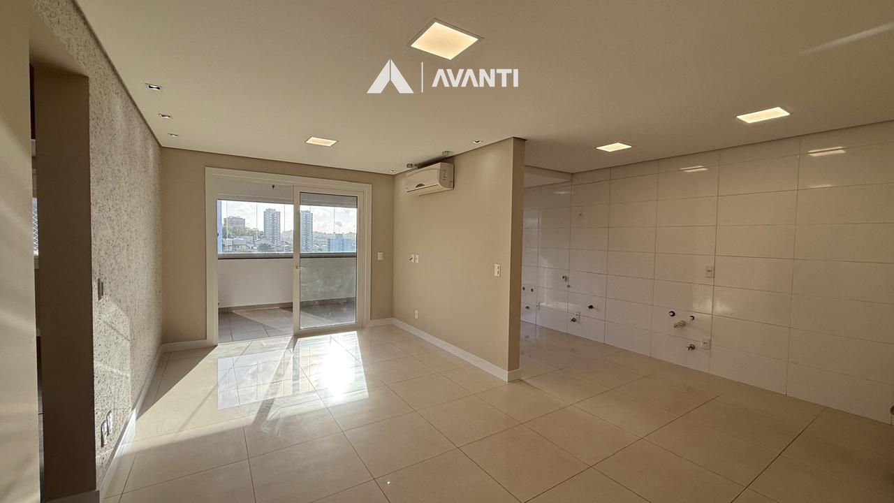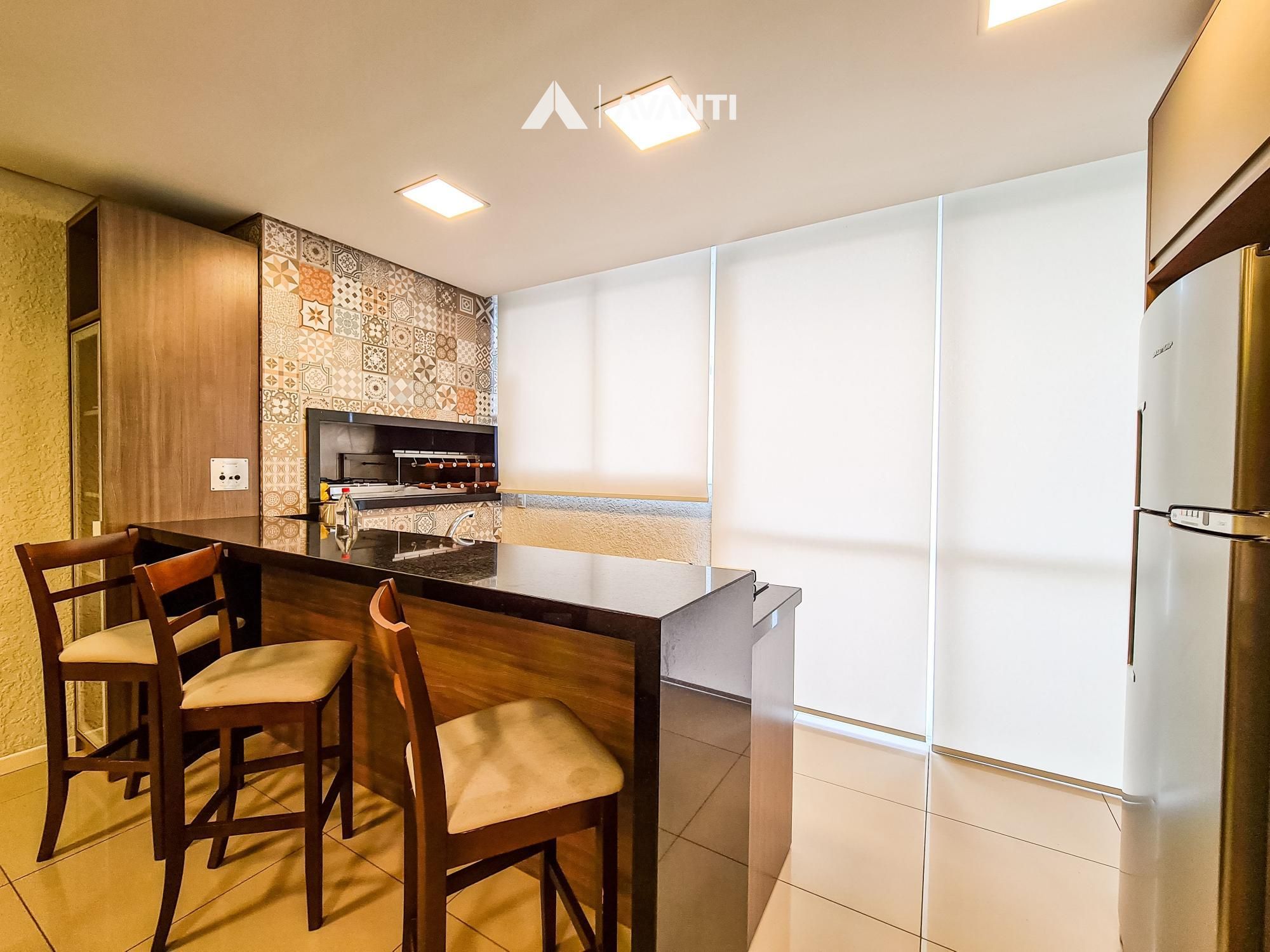 Amplo living em conceito aberto, sacada gourmet com fechamento reiki, cozinha com área de serviço e banheiro social.
