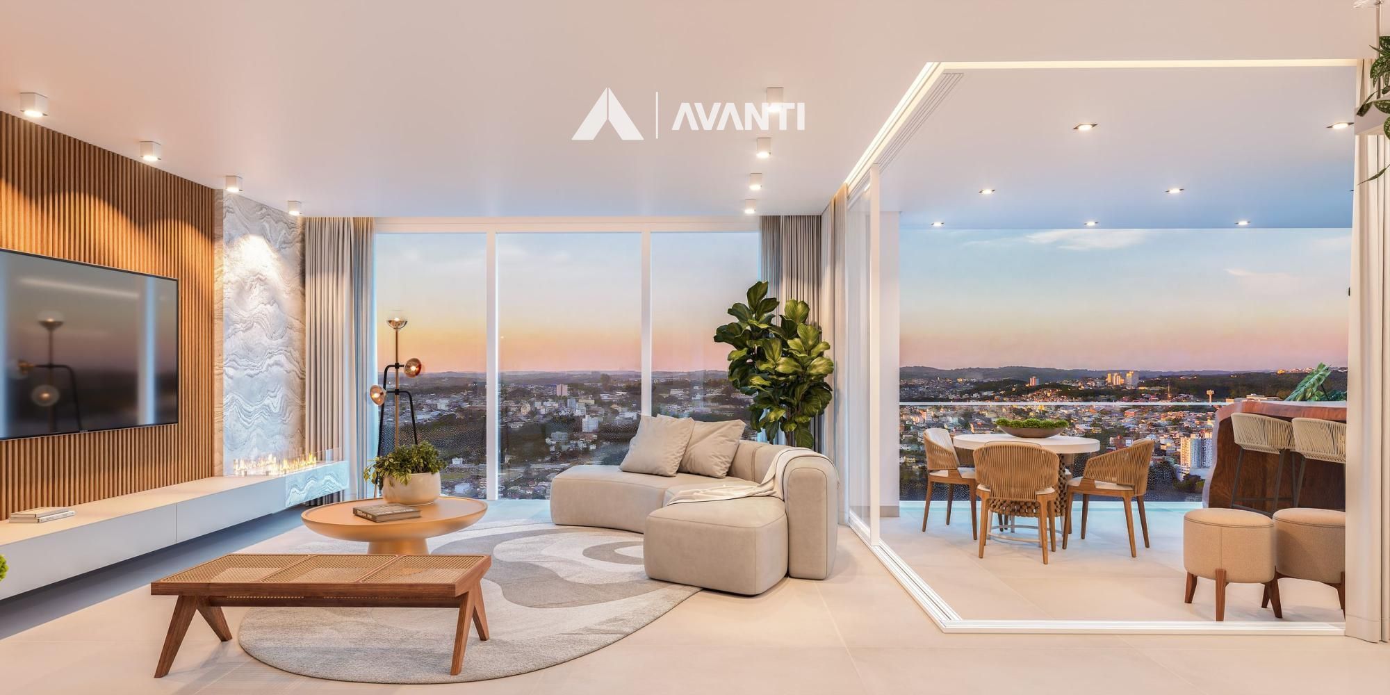 Área social com amplo living integrado à cozinha com churrasqueira e à sacada.