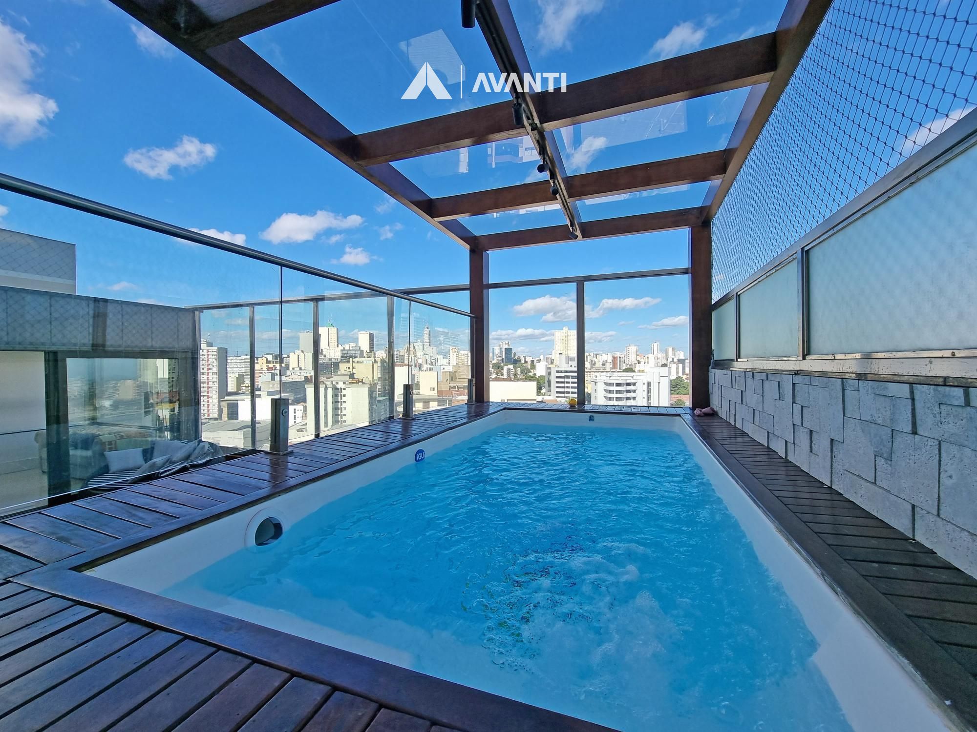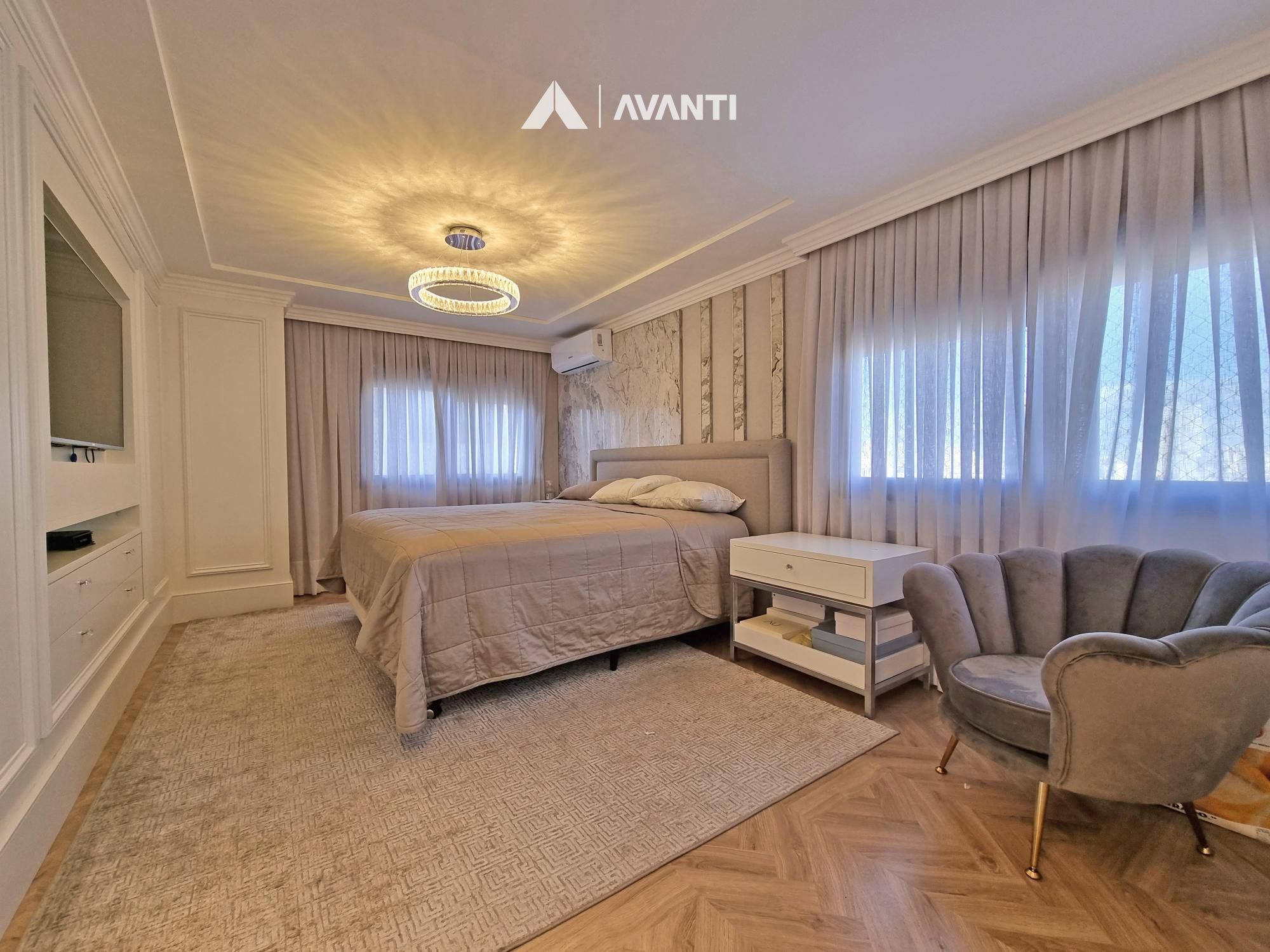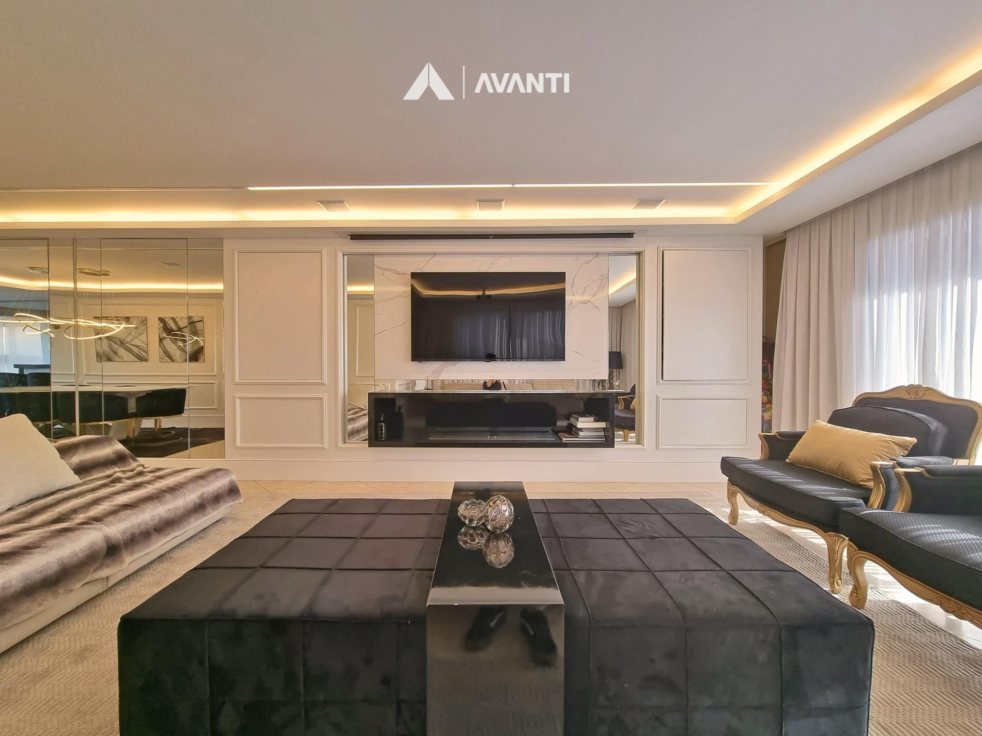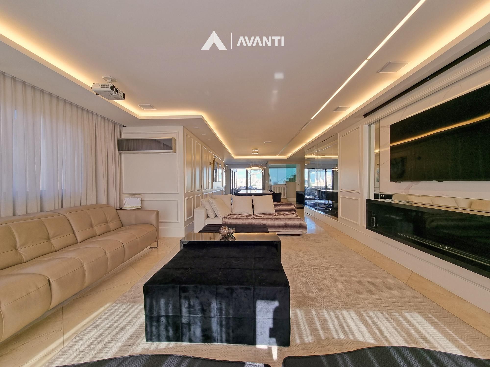 Pavimento inferior: Majestoso hall de entrada com jantar, sala de estar com sacada, lavabo, espaço gourmet, amplo terraço com piscina aquecida, cozinha e área de serviço.